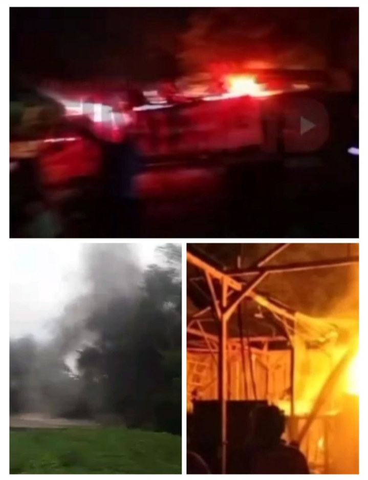 Api segera melahap bangunan gudang beserta isinya. Kobaran api terlihat tinggi dan cukup besar. Asap hitam pekat membumbung ke udara.